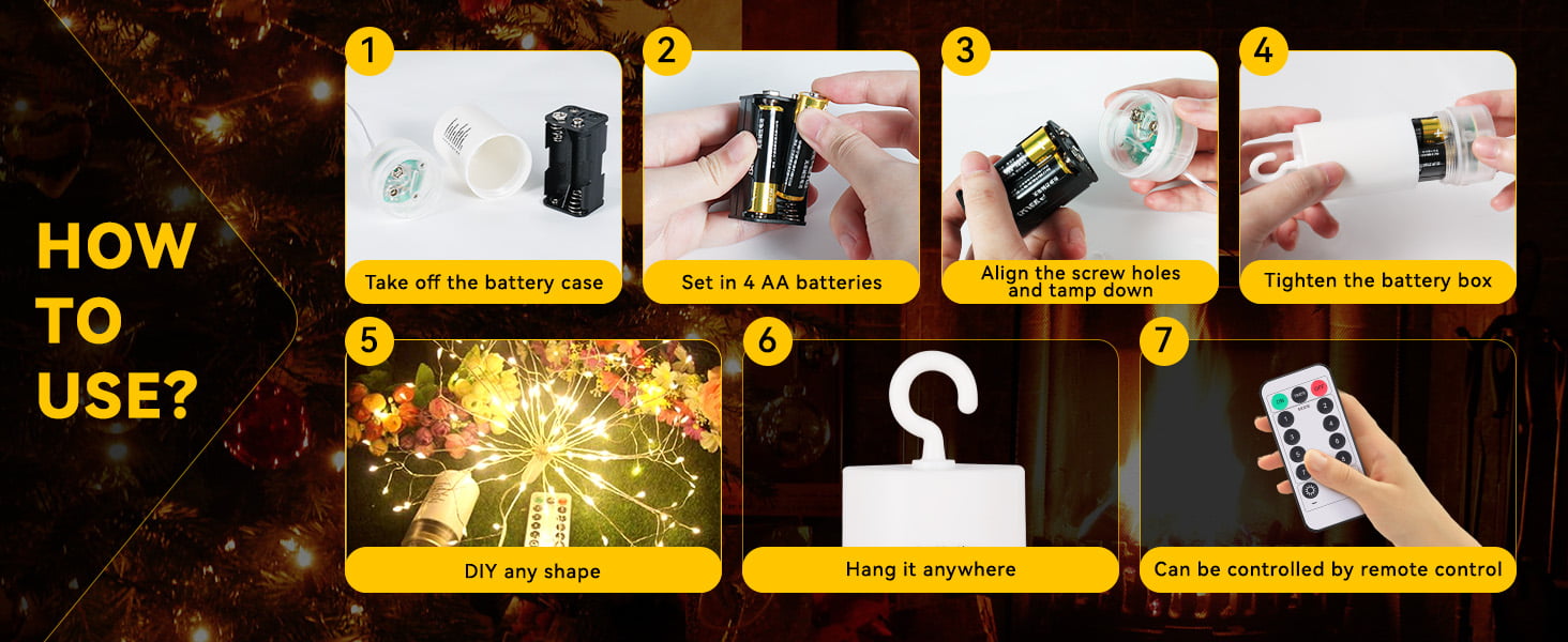 The fireworks lights need 4 AA batteries(not included), battery hanging light gets rid of the socket control, you can put it wherever you need it. No pollution cold light source with low-energy consumption, won't overheat. The light life is over 10,000 hours. All parts of these string lights are waterproof. They can work excellently even on rainy days, ideal ornament for outdoor.
